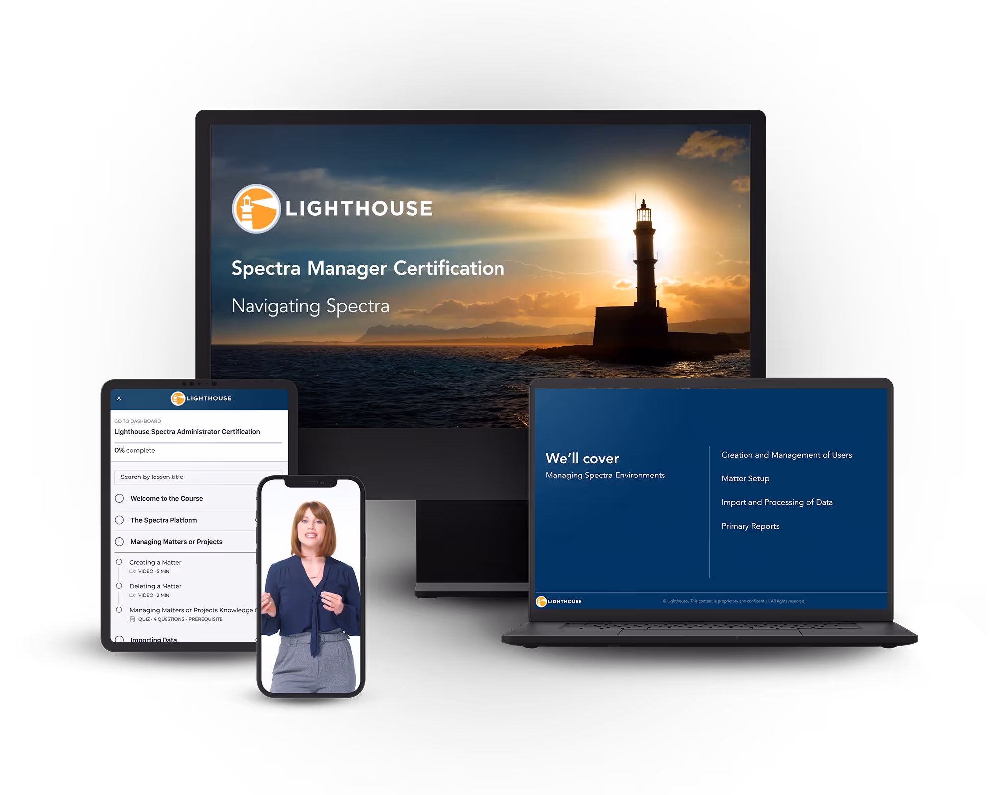 Working with product experts, SMEs, and cross-functional leaders, we built the program from the ground up. Through client collaboration, we developed a full certification experience designed to build trust and confidence in Matter Analytics while showcasing Lighthouse’s leadership in eDiscovery.